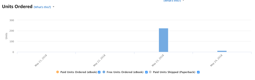 When I logged into KDP on Amazon, I was shocked. When I first checked last evening, there had been 155 downloads! I’m not even sure I’ve had 155 download, paid or free, ever. Downloads continued through the evening, reaching 224 for the entire day.